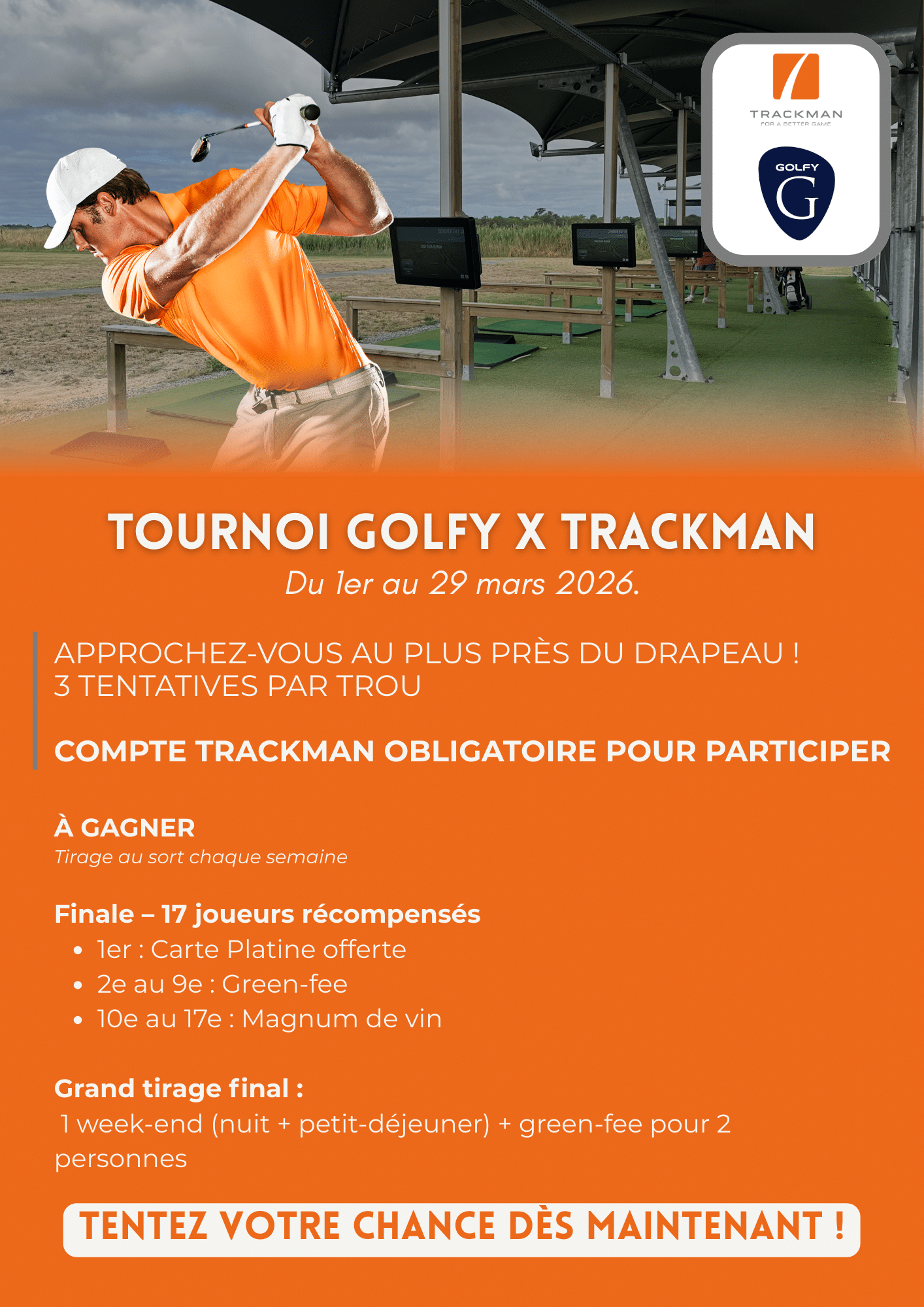 Le practice équipé Trackman propose une dizaine de postes avec analyse précise de la distance, trajectoire, vitesse de swing et angle d’attaque. Une technologie utilisée sur le PGA Tour, idéale pour progresser efficacement.